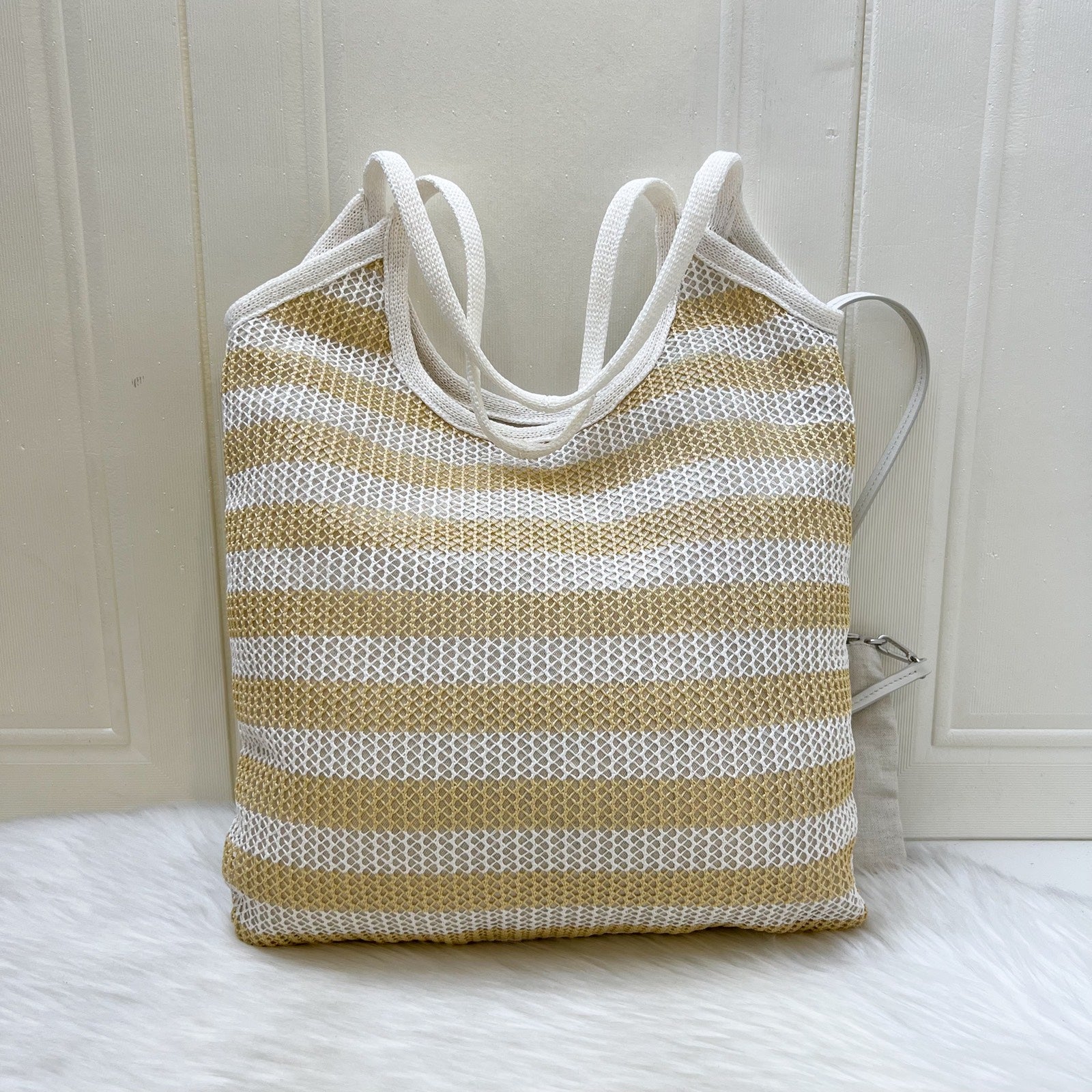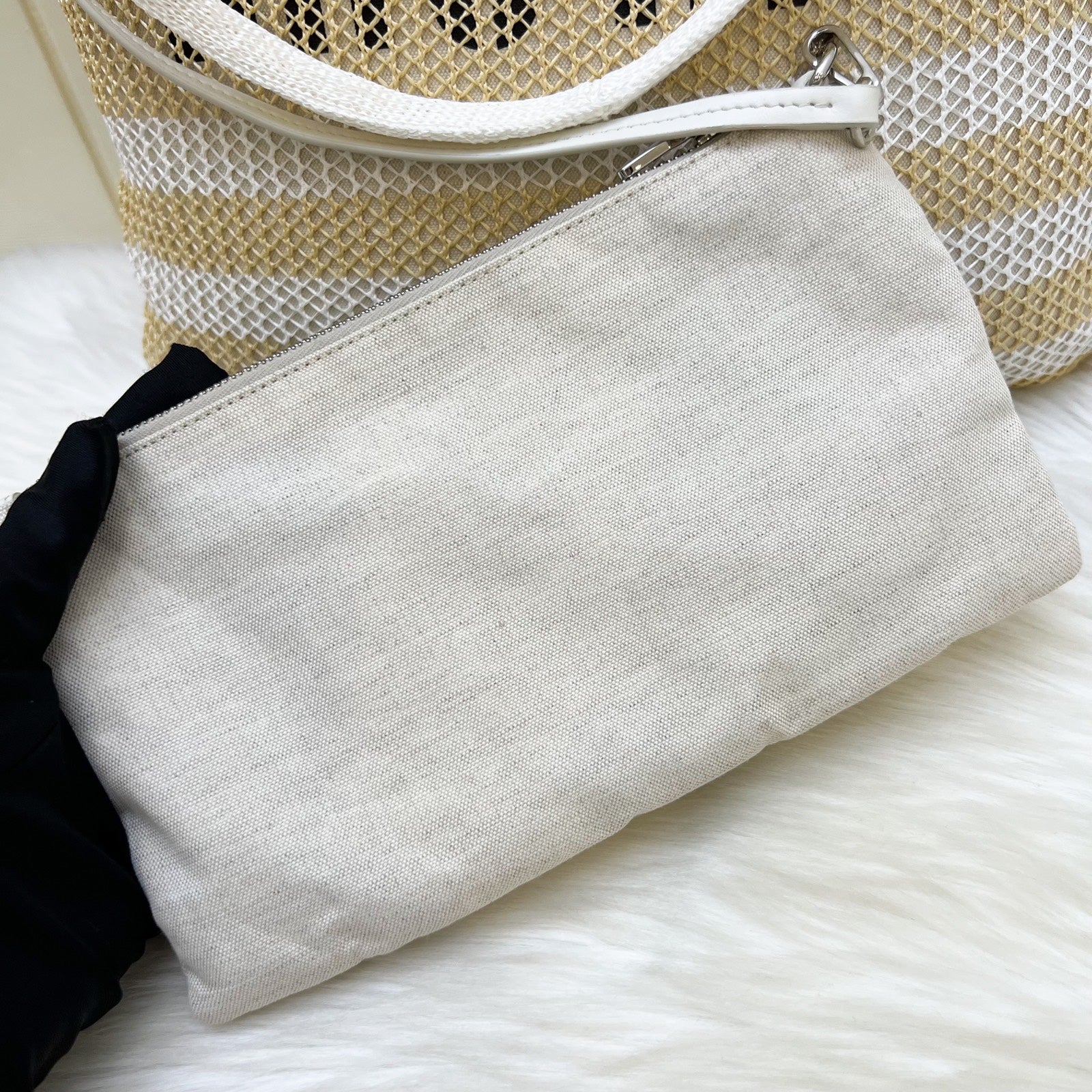 Miu Miu Ivy Tote Bag in Beige and White Woven Fabric Linen (Model: 5BG231)