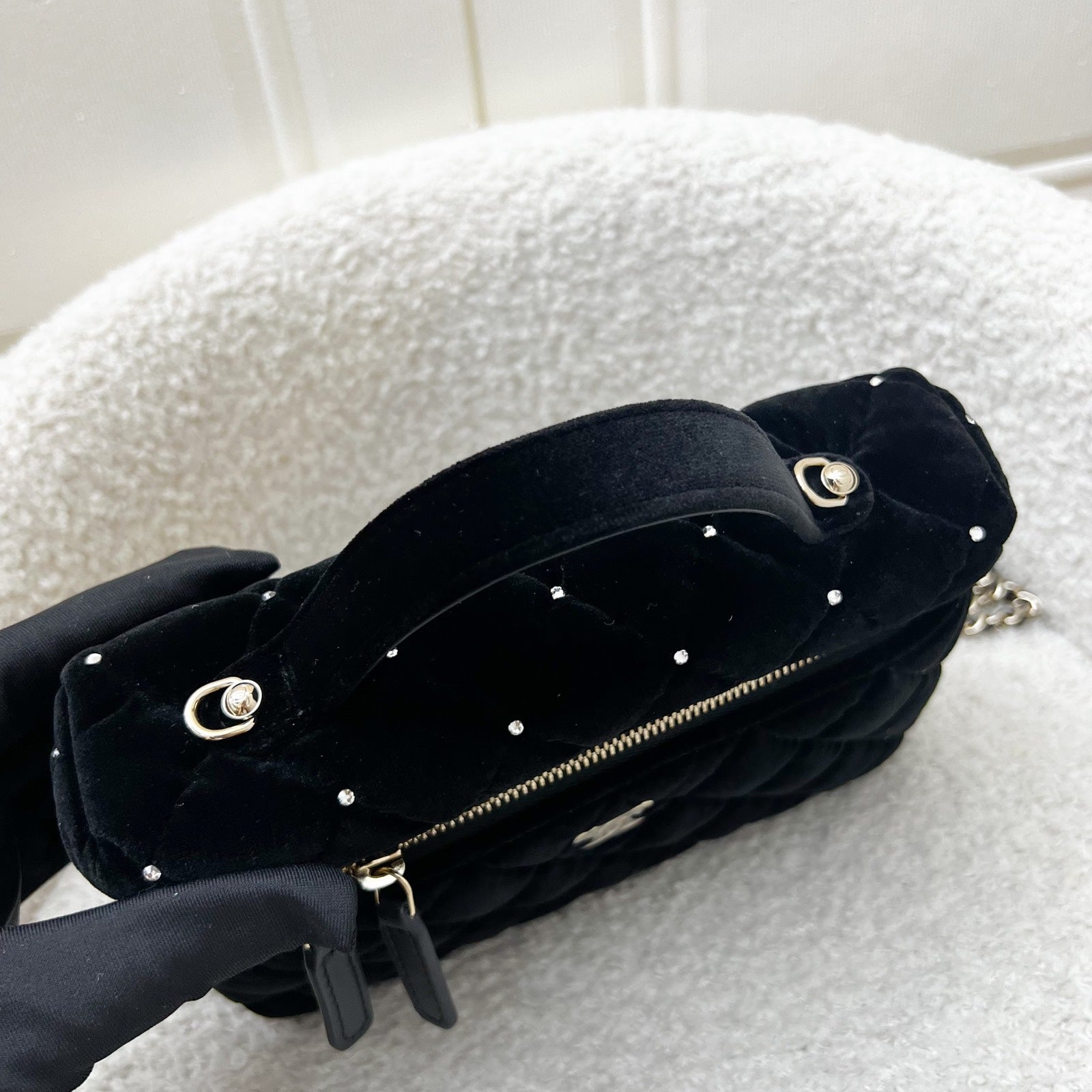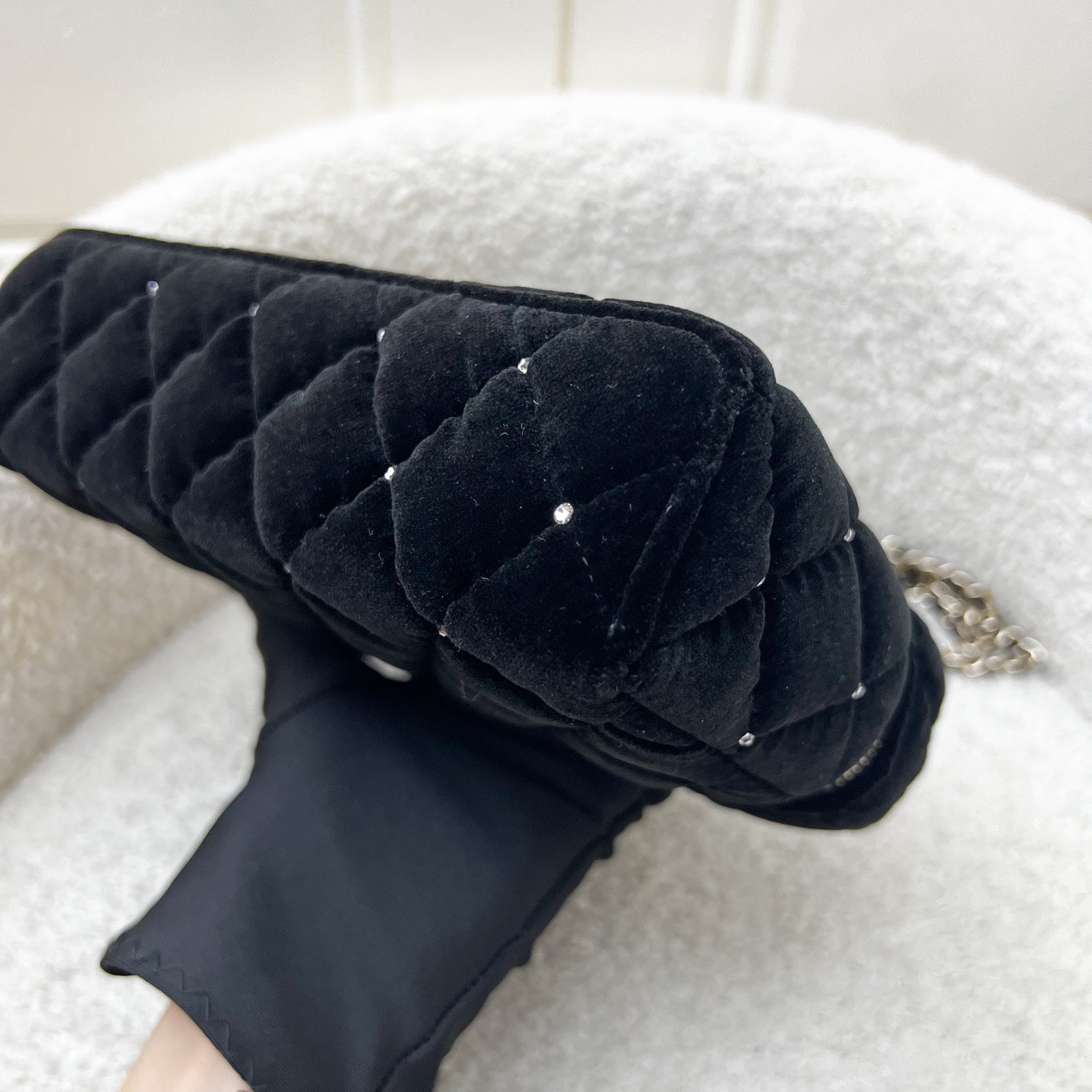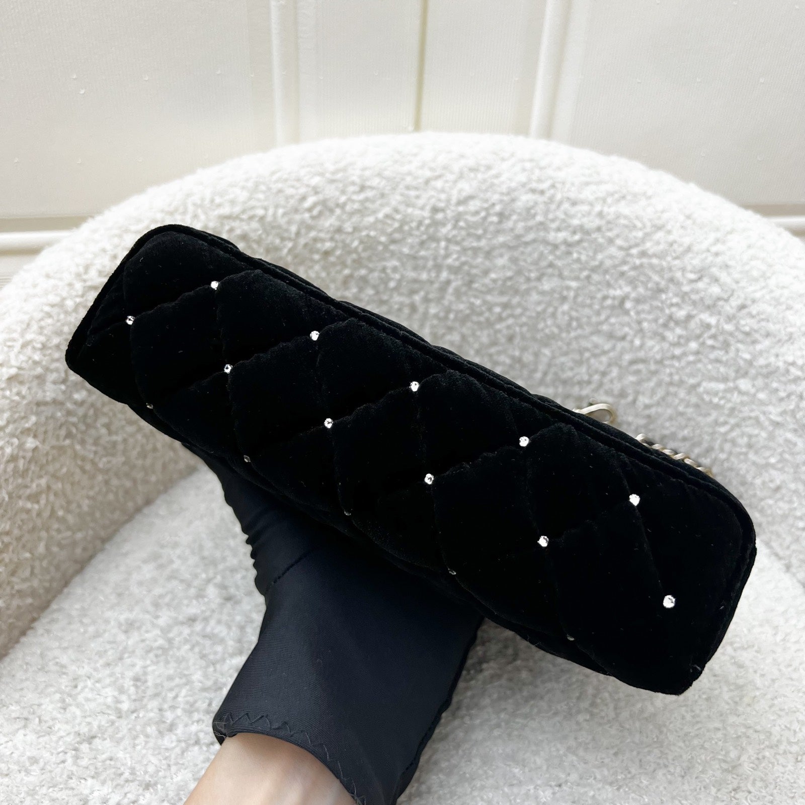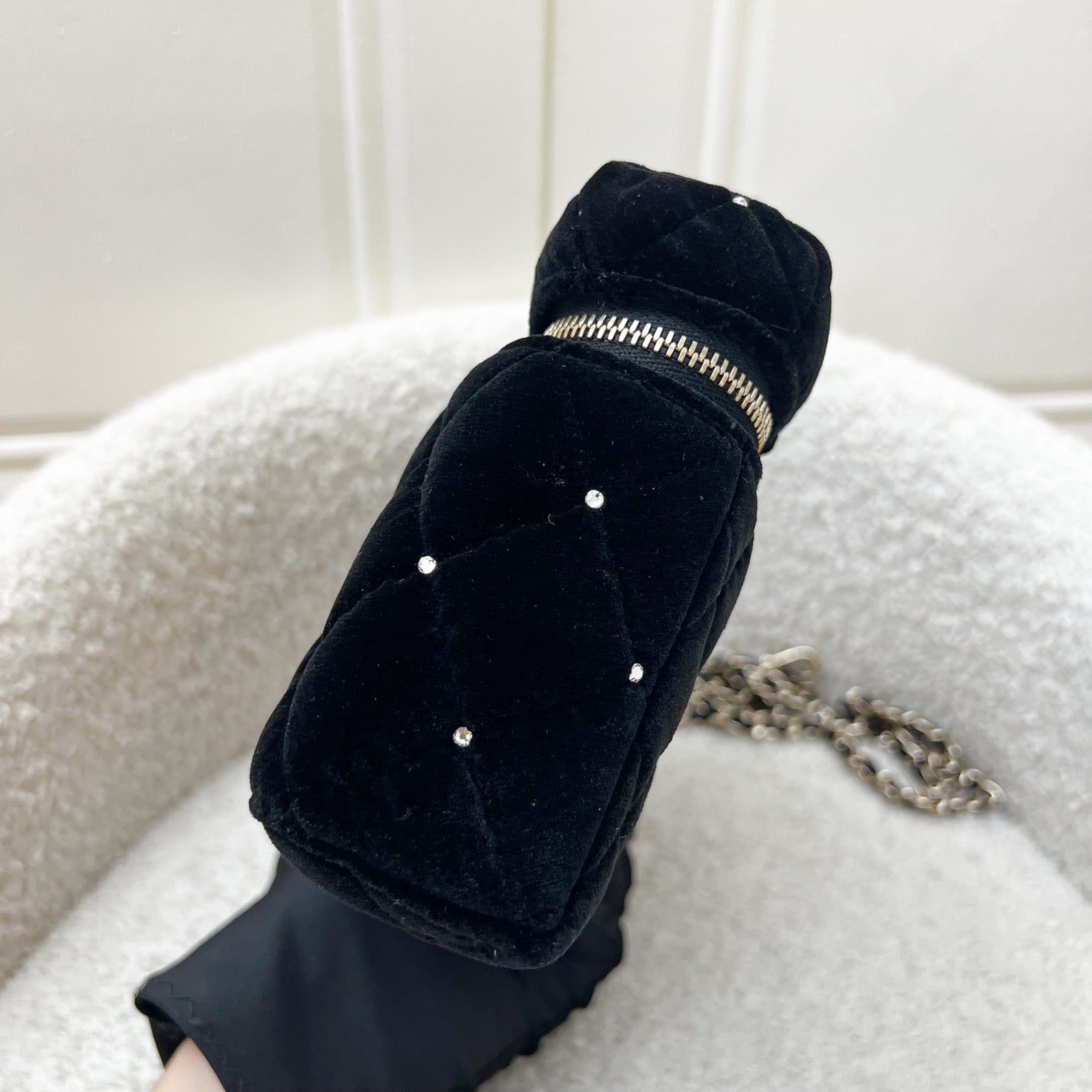 One of the hottest designs of 2025 / 2026 and this newest piece is gorgeous velvet and diamantes! Super glam and hard to get in boutiques worldwide. Gorgeous bag in popular Loro Piana style. Fits all phones (even Iphone Pro Max). This model comes with detachable chain. Grab this before it flies off!