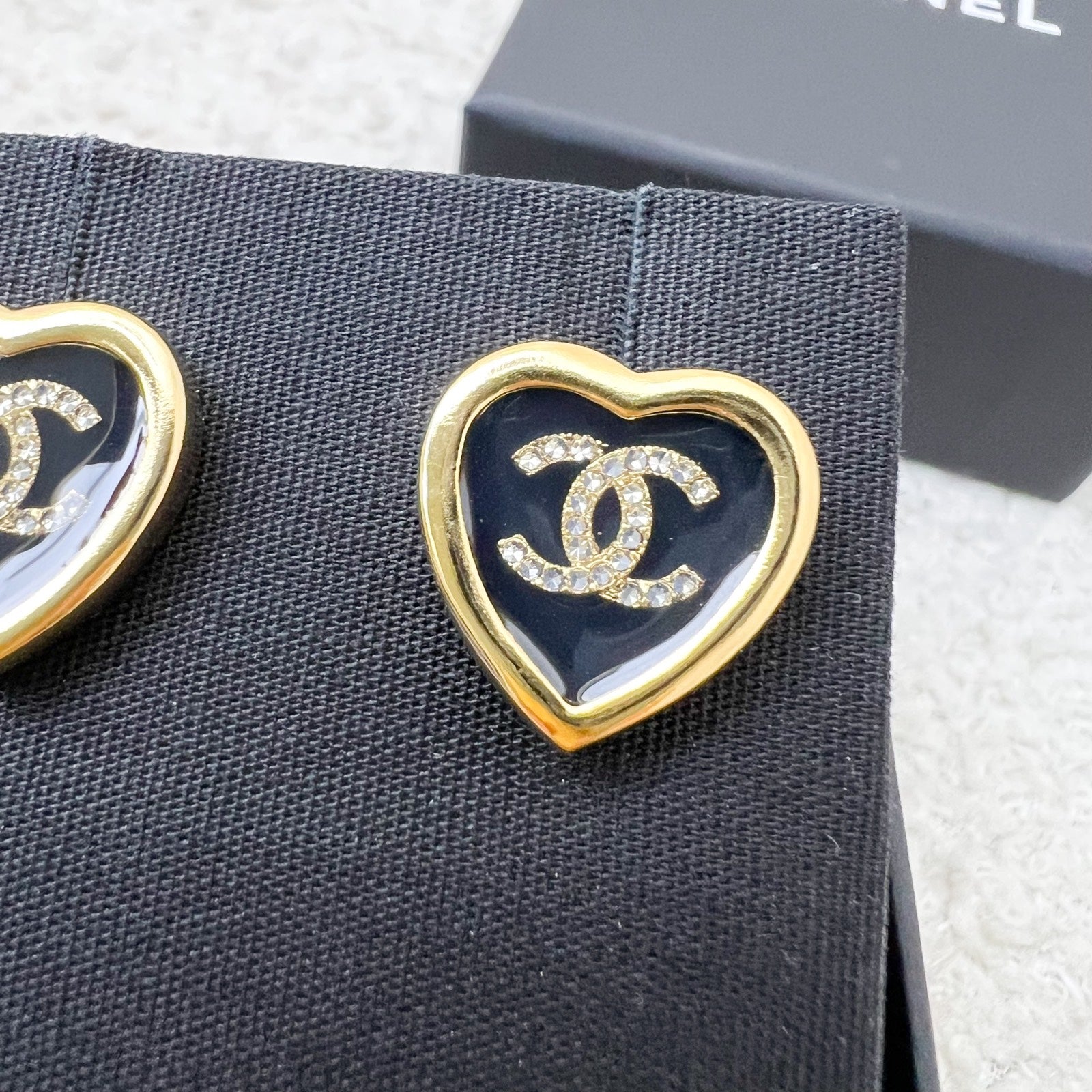 Chanel 25B Heart Earrings with Crystal Studded CC in Black Enamel and LGHW